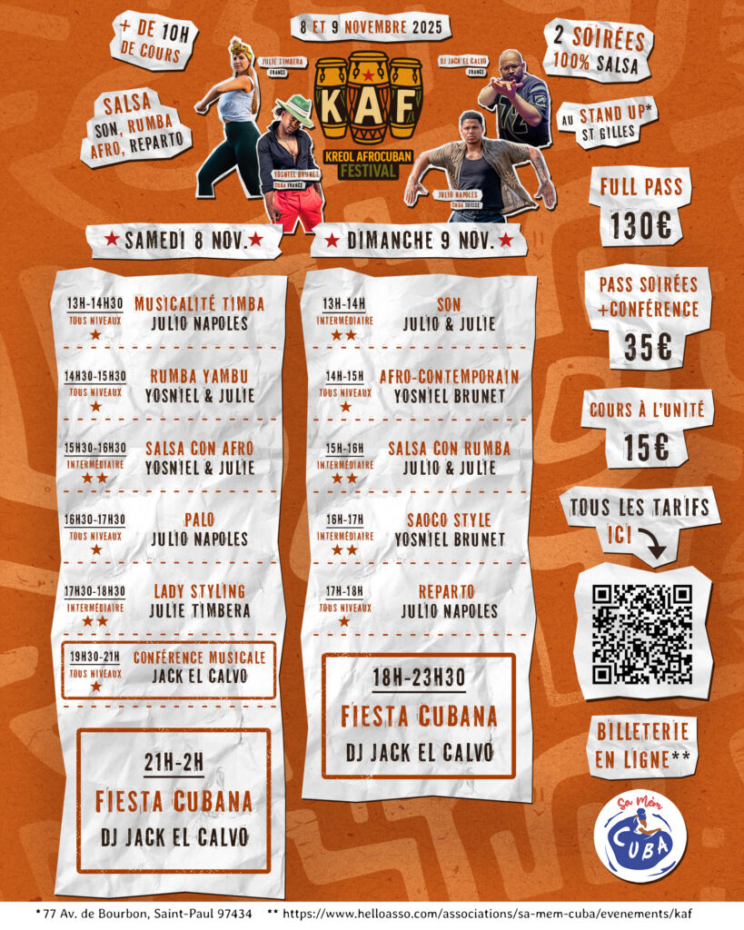 Le KAF, ou Kreol Afrocuban Festival, est un événement pour les passionnés de musiques et de danses cubaines et afro-cubaines à La Réunion. Les 8 et 9 Novembre 2025 au Stand Up Fitness, Sa Mem Cuba vous propose une immersion totale dans l’univers de la salsa.